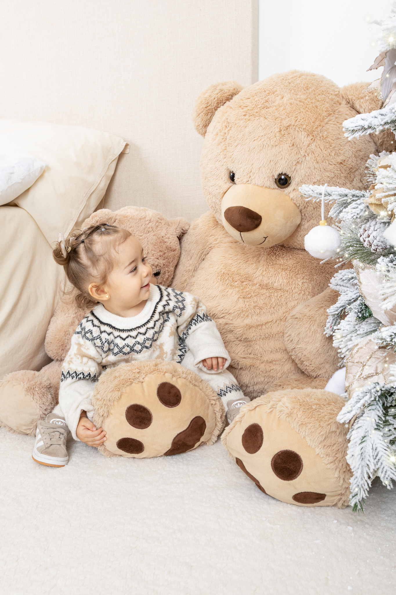O cenário deste ano inspira-se num quarto acolhedor, com tons branco, bege e dourado. Cores neutras que combinam perfeitamente com roupas tradicionais de Natal ou estilos modernos e suaves.